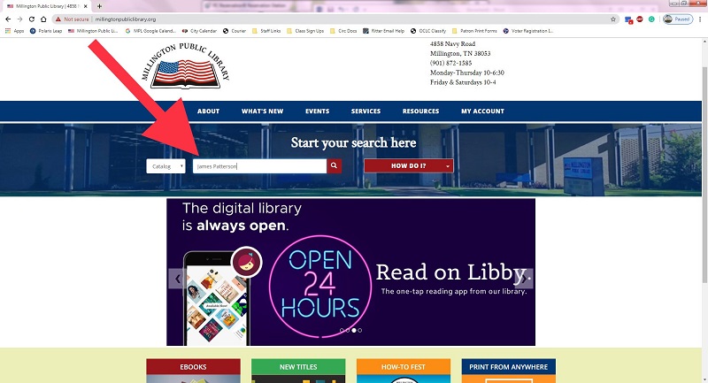 You can search our catalog by author, title, or keywords right from our homepage! Type what you are searching for into the search box at the top of the page. Then, press the Enter key on your keyboard or click the magnifying glass button on the page.