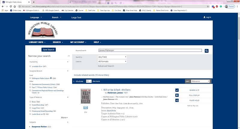 You can narrow down your results to list only what is here at the Millington Library, what’s currently available, publication date, and more using the checkboxes on the left of the results page.