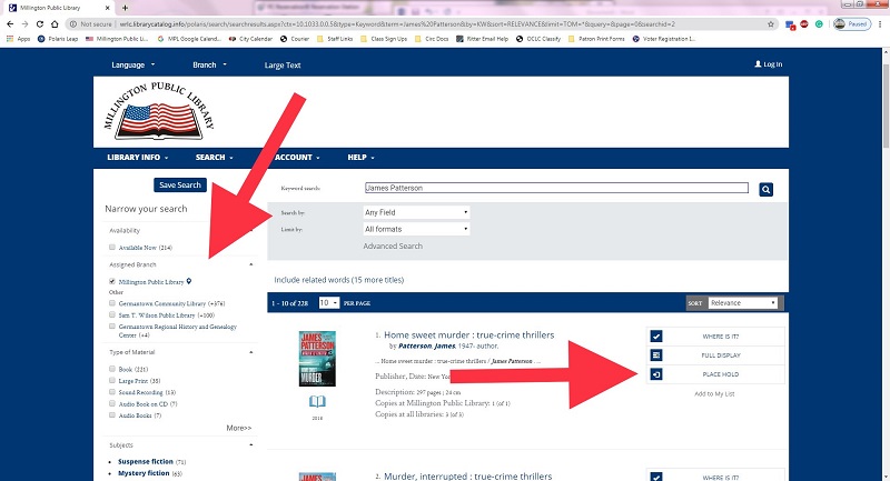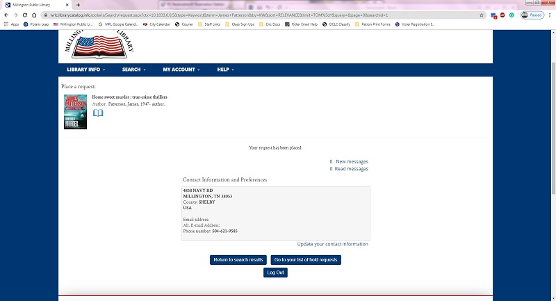 Congratulations, your hold is placed! A staff member will pull your item and reserve it for you. Items coming from Germantown Community Library or Sam T. Wilson Public Library may take up to a week to arrive in Millington. You will receive an automated message by text, email, or phone call when your item is ready for pick-up. Please pick up your items within two weeks of receiving your notification.