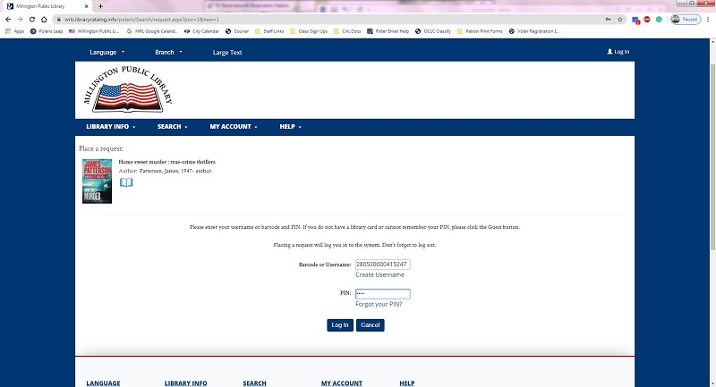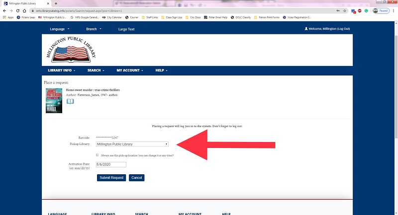 Make sure Millington Public Library is selected as your “Pickup Library” in the drop-down menu. Click “Submit Request”.